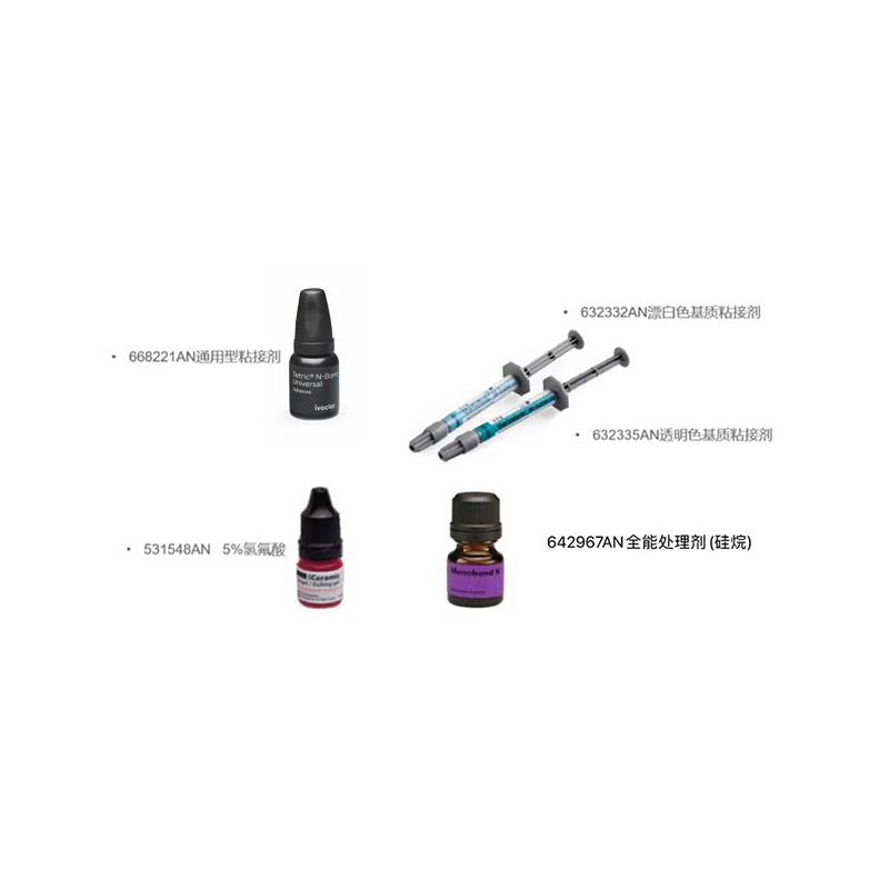 668221AN粘接剂6g*1瓶+531548氢氟酸*1瓶+632332AN漂白色基质1.5ml*1支+632335AN基质透明色*1支+642967AN硅烷处理剂5g*1支