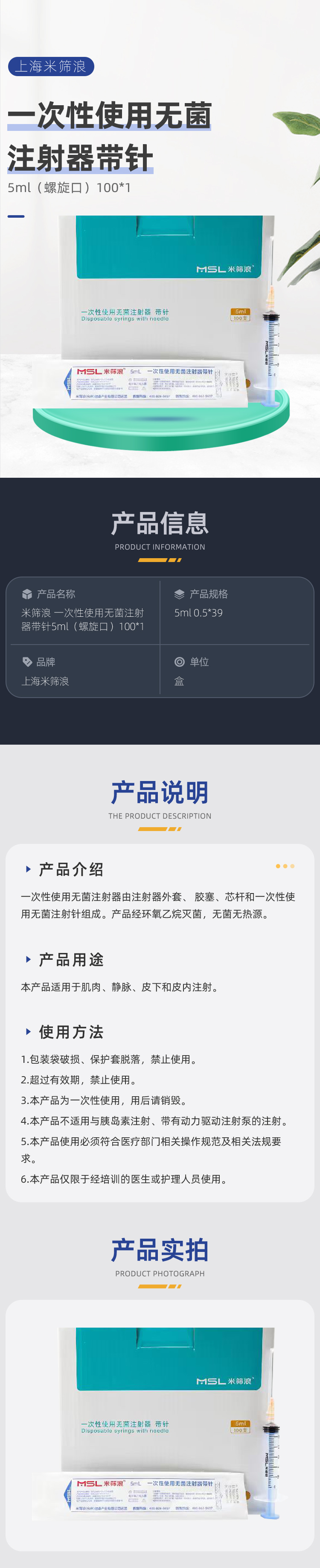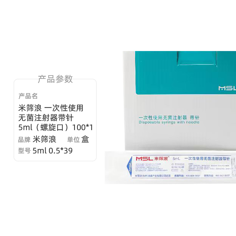 米筛浪 一次性使用无菌注射器带针5ml(螺旋口)100*1商品编号:2880002001